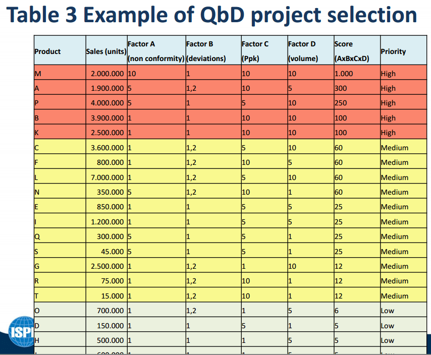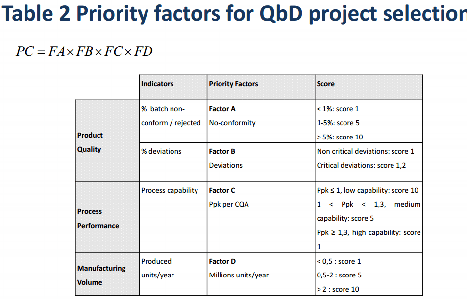 Chapter 4.3. is devoted to explain a “Prioritizing tool to choose candidates for improvement projects”. This is just a way to consider factors as rate of rejected batches, rate of deviations, process capability indicators and number of units produced by year to find the best candidates. In other words, to find low quality/high volume candidates to maximize ROI.