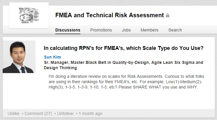 I posted the question in 3 communities: 1. Quality-by-Design; 2. FMEA and Technical Risk Assessment; 3. iSixSigma.